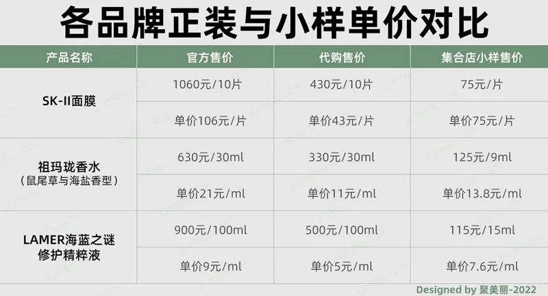 记者在探访Onlywrite线下门店时,有留意到店内祖玛珑香水、SK-II面膜、LAMER海蓝之谜修护精粹液的小样售价,与品牌产品正装在官方旗舰店和代购方售价做了单价对比,如下方图表所示: