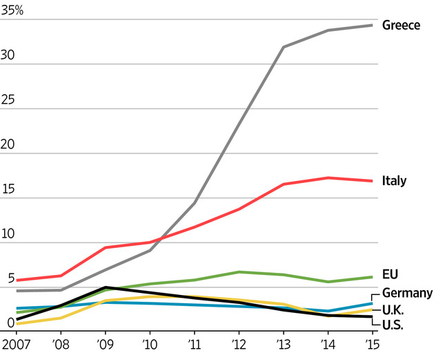 据《华尔街日报》估算,意大利银行系统目前的坏账规模达到3600亿欧元,大约相当于该国国内生产总值(GDP)的四分之一。这使意大利银行业的坏账率高达17%,而美国银行业的坏账率即便是在金融危机期间也才5%。