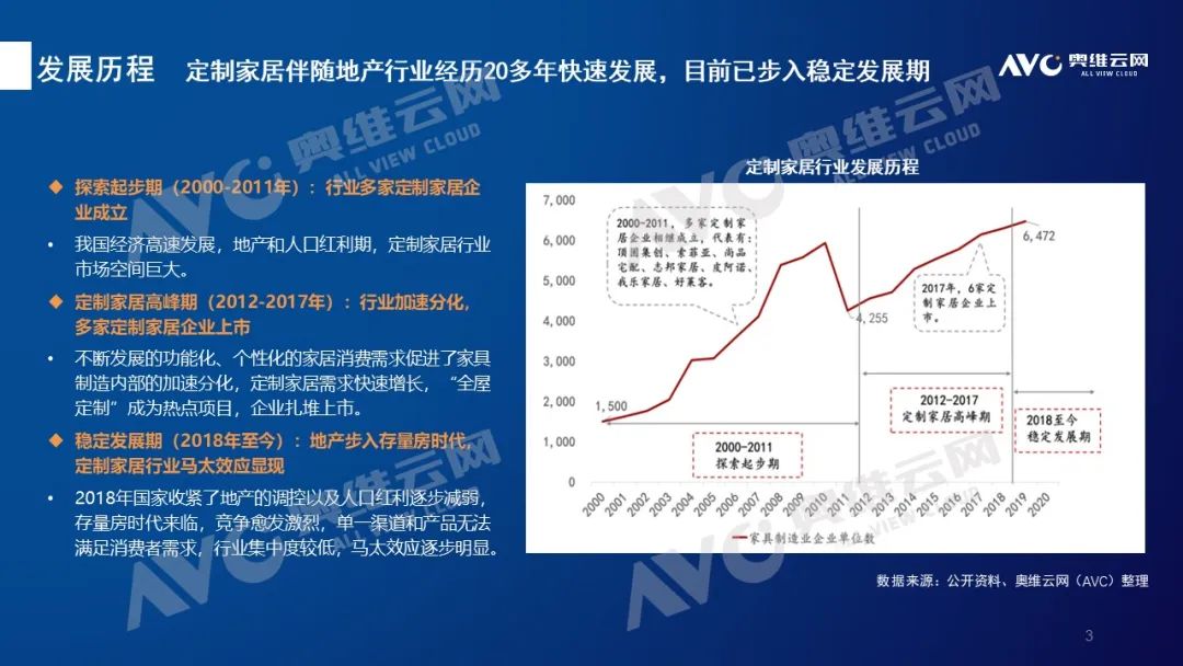 定制家居行业从2000年左右开始的探索起步期,到2012年开始的高峰期,再到目前的稳定发展期,紧跟地产行业的发展历程。多家定制家居企业在不断满足消费者需求,给客户提供源源不断价值的同时,也实现了自身的快速发展,成功登陆资本市场。