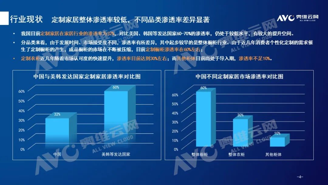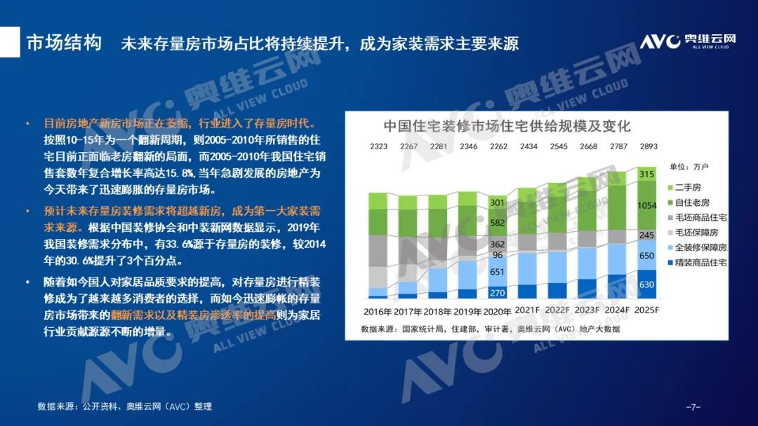 随着中产阶级群体不断增加,越来越多消费者个性化、定制化需求的增加,定制家居行业仍具有较高发展潜力,如今迅速膨帐的存量房市场带来的翻新需求以及精装房渗透率的提高则为家居行业贡献源源不断的增量。