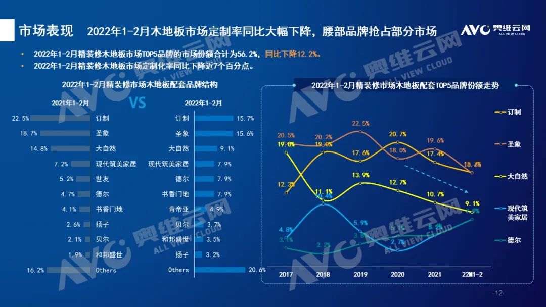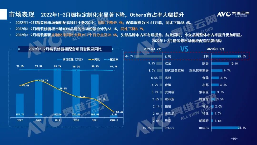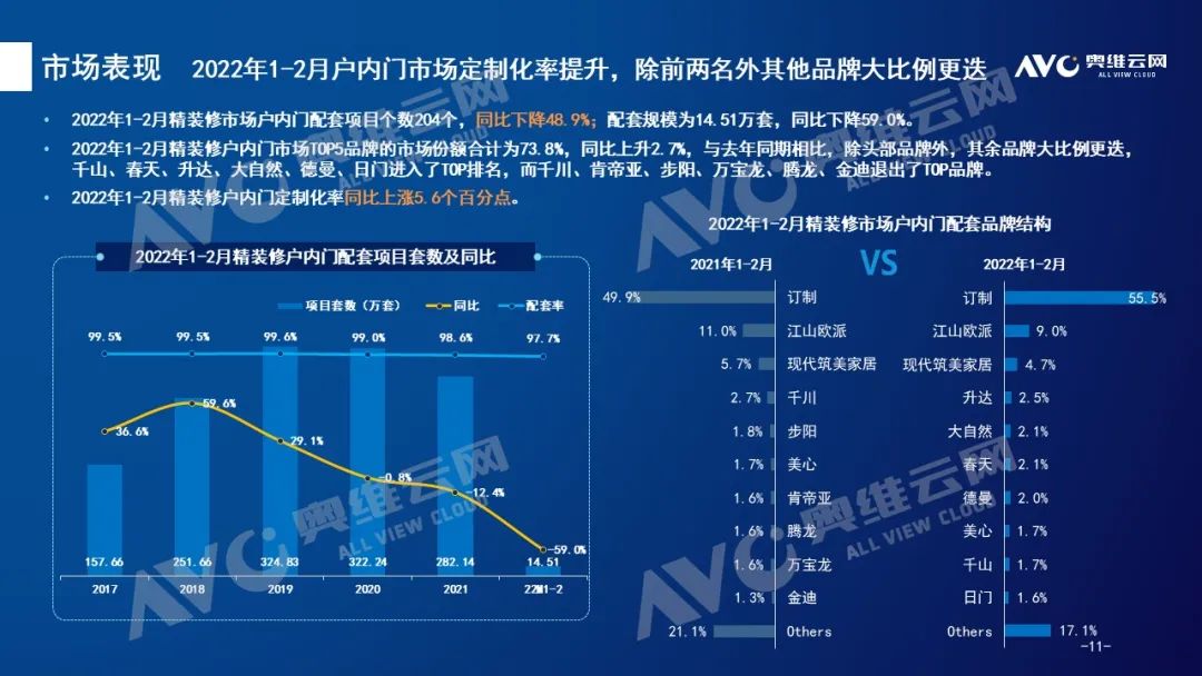 市场端,2022年1-2月,精装修市场橱柜、木地板定制化率显著下降,腰部品牌、Others市占率上涨明显,户内门市场定制化率有所上升,除前两名品牌外其他品牌大比例更迭。
