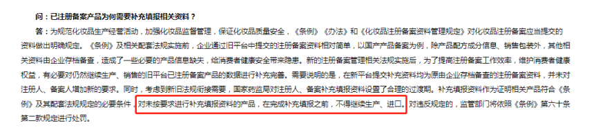 针对“已注册备案产品为何需要补充填报相关资料”的问题,国家药监局指出,此前在旧平台提交的注册备案资料相对简单,国产产品备案仅能查询到产品配方成分信息和销售包装,其他相关资料均由企业存档备查,由此造成了一些必要信息的缺失,所以需要对相关数据进行补充完善。
