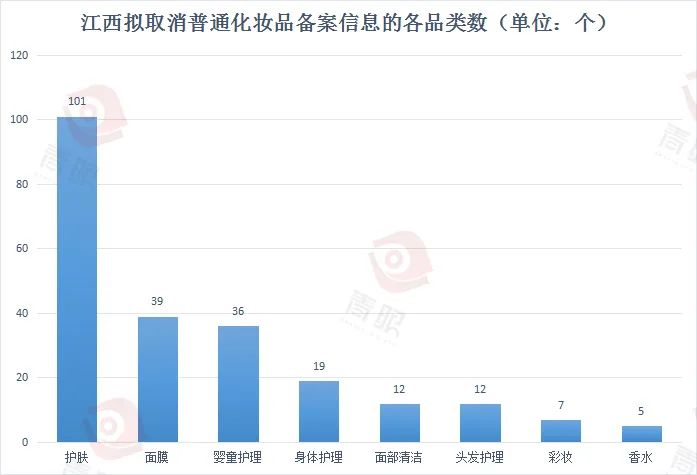 青眼统计发现,在拟取消备案信息的产品中,护肤品类占比最高,占比接近一半;其次是面膜类产品,共涉及39个产品;另外,婴童产品共36款产品被取消备案。
