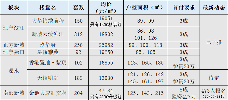 与此同时,金陵华夏中心和纯新盘都会江来府,也已经于上周开盘,去化成绩亮眼,中海观江樾、芳原等新盘也预计将于本周入市。