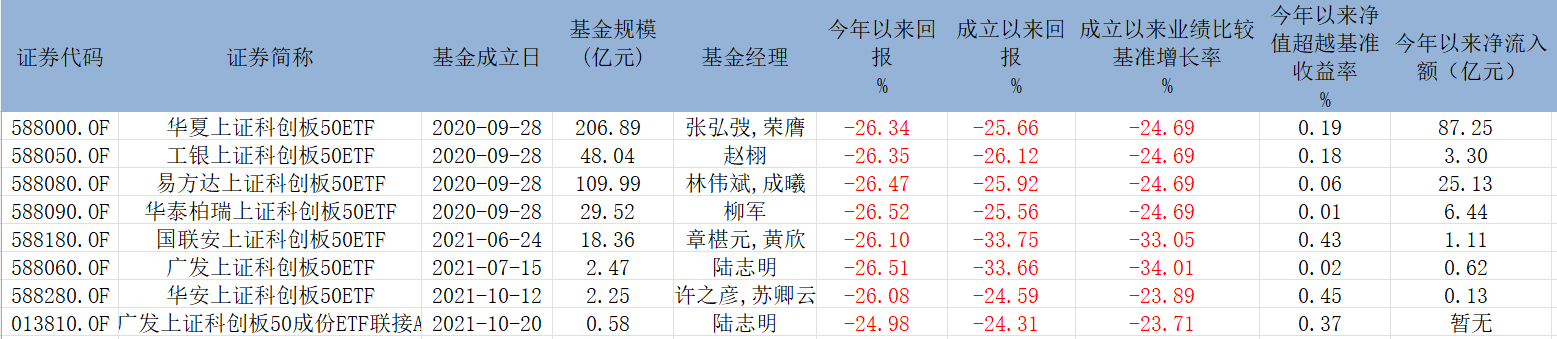 虽然业绩不佳,但作为投资者一键布局科创50指数的优质标的,上述8只产品今年仍有资金净流入。Wind数据显示,华夏上证科创50ETF今年以来净流入金额最多,高达87.25亿元;易方达上证科创50ETF次之,净流入25.13亿元,华泰柏瑞上证科创50ETF净流入6.44亿元。