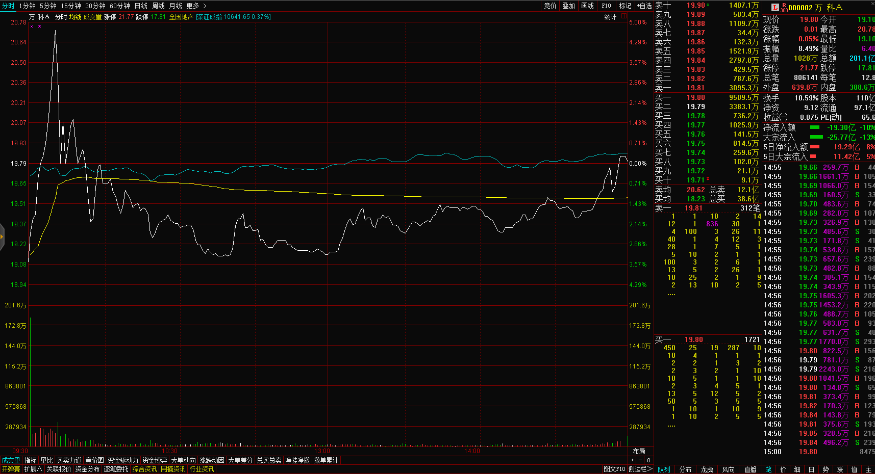 其后盘中漫长的时间,万科A的价格都处于下跌,也就是说在宝能系增持线以下。但又是尾盘收市前半小时,股价突然出现异动,价格强势拉升至翻红,收盘报19.80元/股,较前一个交易日微涨1分钱。