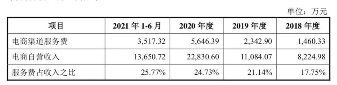 阿宽食品电商渠道服务费与电商自营收入之比 来源 / 招股书