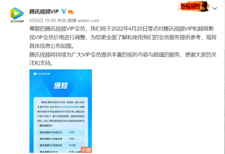 对于长视频骨灰级用户罗宾来说,从去年12月开始各平台普遍性的会员涨价,每次都跟他有关系。腾讯视频宣布将于4月20日零点开始上调会员价格后,他看了一下细则得知,作为连续包月VIP每月的费用上涨了5元。