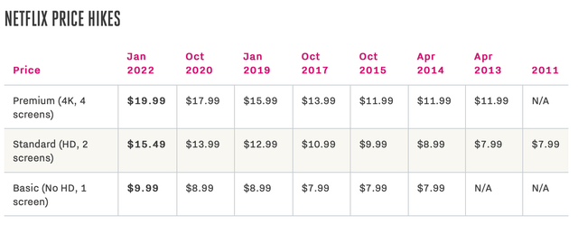 截至2022年初,Netflix已经经历了六次涨价,标准计划(1080P,2 台设备)从最初的7.99美元提升至15.49美元,高级计划(4K,4 台设备)从11.99美元涨到了19.99美元;Disney+全球订阅数破8600万后,也宣布进行首次提价。