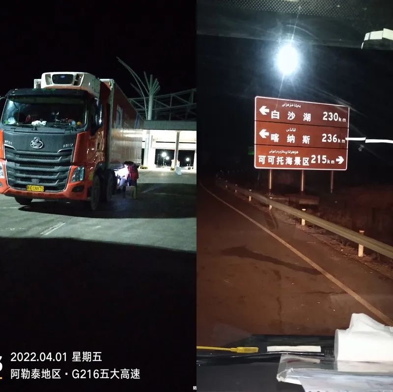 4月4日晚上九点多,李师傅和胡师傅终于驱车到达上海的最后一个服务区。从新疆北屯市装车,再到克拉玛依领取通行证最后到达上海,五千多公里的路程,两位卡车司机师傅交替开车,走了四天。