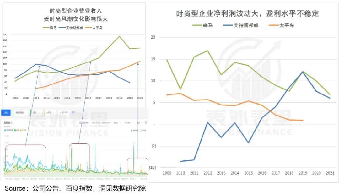 上述说过,风潮是不断变化,而一旦下一次抓错风潮,对收入的打击就更不用说了。如此一来,反馈在数据上就是时尚类企业的盈利稳定性较差。