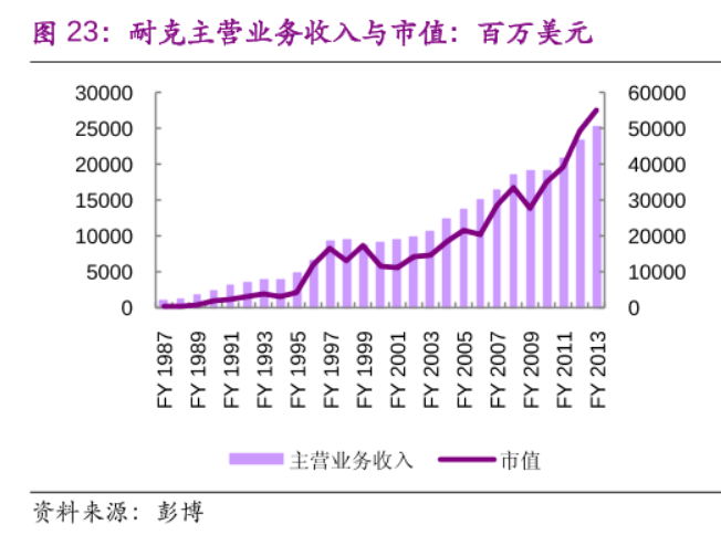 借此,耐克的业绩,持续稳定增长。这传导到资本市场上,就是1987年之后耐克的市值一路飙升,不断创新高。