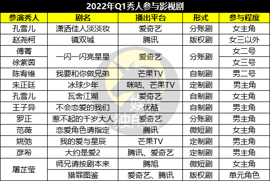 另外,据不完全统计,2022年Q1共有11部秀人出演的长剧集(非微短剧)播出,其中8部由秀人出演男女主角,1部由秀人出演女二号和女三号,这些由秀人出演重要角色的剧集,以平台B级自制定制以及分账剧为主,此外秀人还会主演一些优爱腾芒的横屏微短剧。这也基本反映了秀人当下参与影视剧作品的现状,视为中轻体量腰尾部剧演员的主要后备役人选。