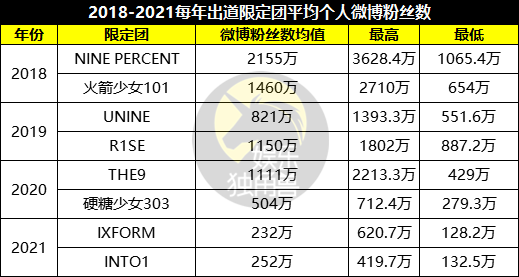 最高和最低的数量之间几乎相差了10倍,如果今年仍有选秀,按照这样逐年递减量级的趋势,今年限定团的平均个人微博粉丝数或可能不到100万。