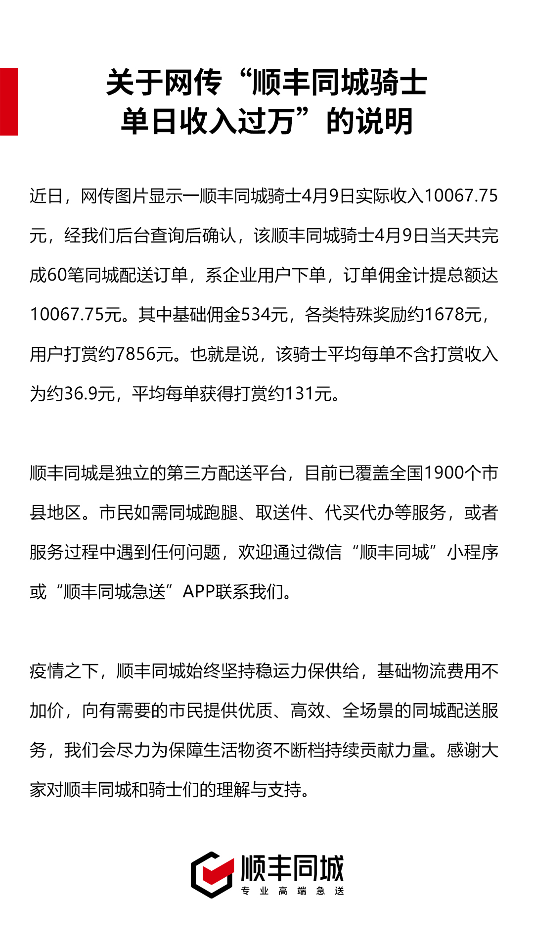 4月11日,顺丰同城对外回应称,经过后台查询确认,该顺丰同城骑士在4月9日当天共完成60笔同城配送订单,系企业用户下单,订单佣金计提总额达10067.75元。其中基础佣金534元,各类特殊奖励约1678元,用户打赏约7856元。也就是说,该骑士平均每单不含打赏收入为约36.9元,平均每单获得打赏约131元。