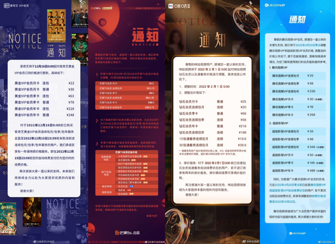 4月9日,腾讯视频宣布将于4月20日正式上调会员价格,上涨幅度在5-20元不等。在此之前,爱奇艺也于去年12月宣布上调黄金VIP多种服务价格,调整幅度在9%到20%之间。随后,芒果TV、咪咕视频也相继上调了会员价格。同时期内,海外视频平台Netflix同样上调了包括韩国、美国、加拿大等在内的多国市场的会员价格。