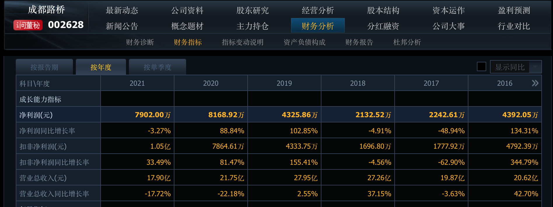 从过往数据来看,成都路桥的营业收入连续两年下降,2020年为21.75亿元,2019年为27.95亿元。比较拿的出手是扣非净利润这一数据,成都路桥已连续3年大幅增长,2019年扣非净利润4333.75万元,同比增长率为155.41%,2020年扣非净利润为7864.61万元,同比增长了81.47%,2021年为1.05亿元,增幅33.49%,不过虽然有增长,但增幅却逐年收窄。