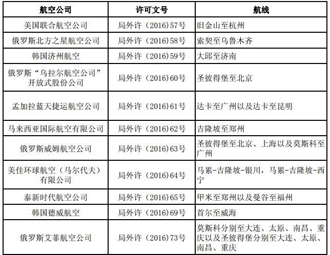 根据中国民航局发布的《关于2016年第二季度颁发的国际航线经营许可信息通报》,今年第二季度民航局共向49家航空公司(16家国内航空公司,33家外航)颁发了国际航线经营许可,涉及航线132条(外航67条,国内航空公司65条),其中包括6条全货运航线。