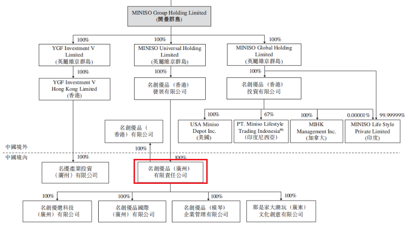 其中,仅在名创优品旗下附属公司名创优品(广州)有限责任公司(下称“名创有限”)控股的22家公司中,与周书、郑明勇有关联的便有数家,这些公司包括米尼品牌管理(广州)有限公司、杭州品识管理咨询有限公司,名创优品(十堰)贸易有限公司等。