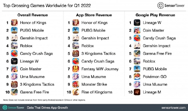 腾讯游戏的基本盘还是相对稳固的,Sensor Tower最新发布的数据报告显示,2022年第一季度全球手游收入排行,排在前三位的还是稳扎稳打的老面孔。