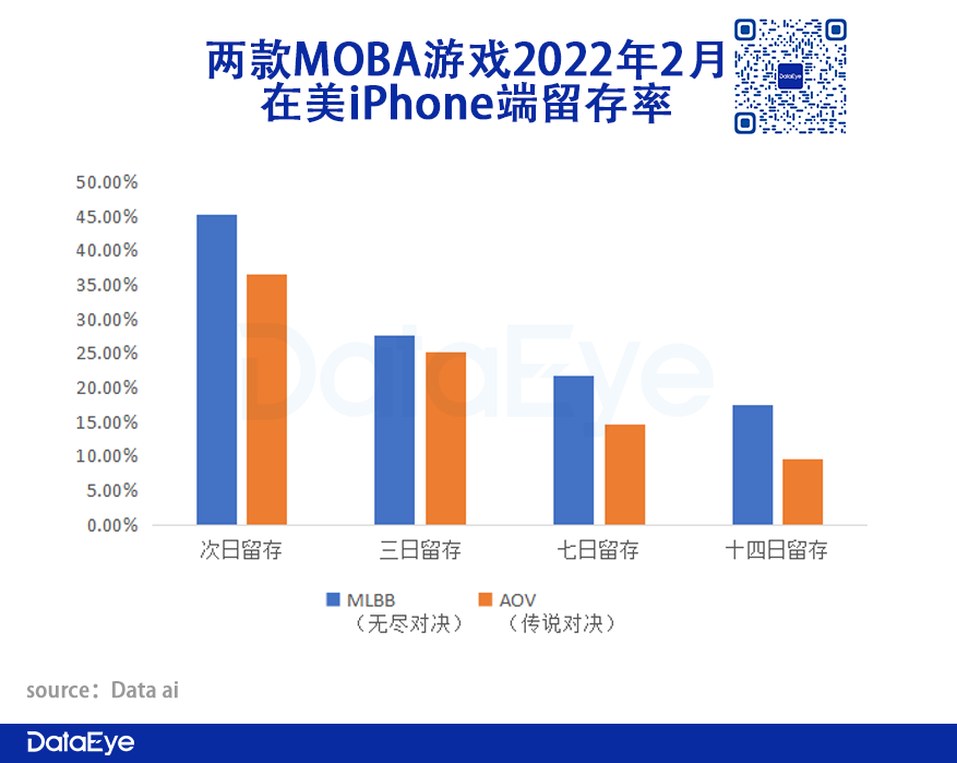 《MLBB》留存率优于《AOV》。今年2月份的两款MOBA手游在留存数据的对比上,《MLBB》次日留存高达45%,而14日留存约为17.33%,均略高于《AOV》。