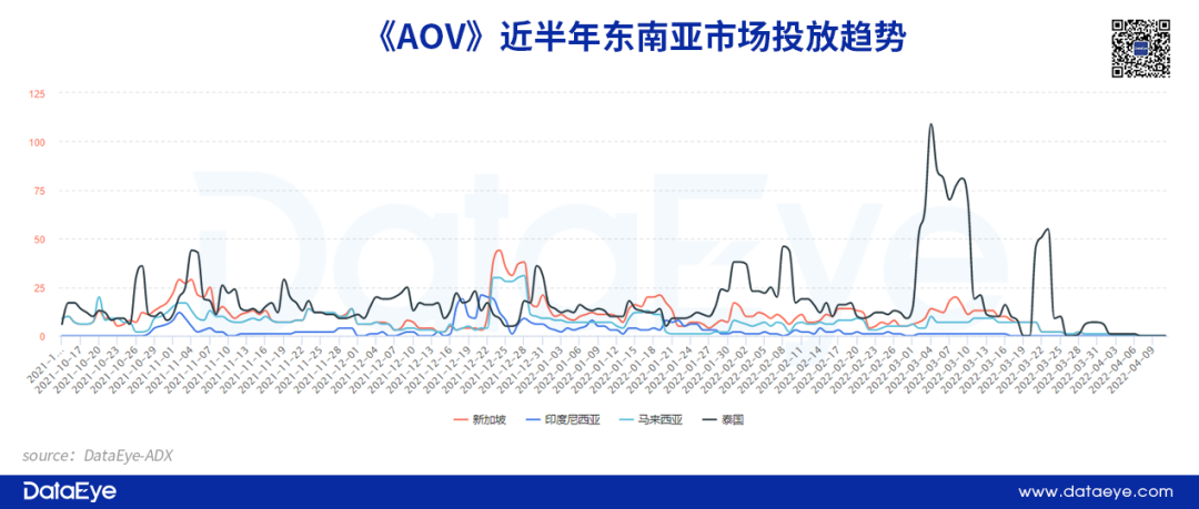 同样,《AOV》在东南亚市场的投放力度并不大,只不过泰国投放力度稍微突出。实际上,《AOV》并没有采用全球同服的运营模式,反而单独划分泰服进行精细化运营。根据DataEye-ADX海外版投放数据显示,泰国单日投放峰值可以超过100余组。此外,凭借在泰国地区大量投放,目前《AOV》泰服无论免费榜和畅销榜都排名第一。