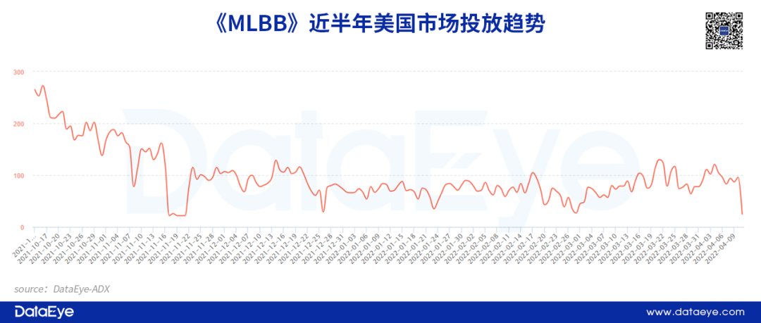 ①美国投放市场:根据DataEye-ADX海外版投放数据,《MLBB》从游戏上线初期,项目组就已经开始针对美国市场进行投放。可是近半年,项目组在美国市场的投放量不断减少,进入2022年后日均投放量不超过100组。
