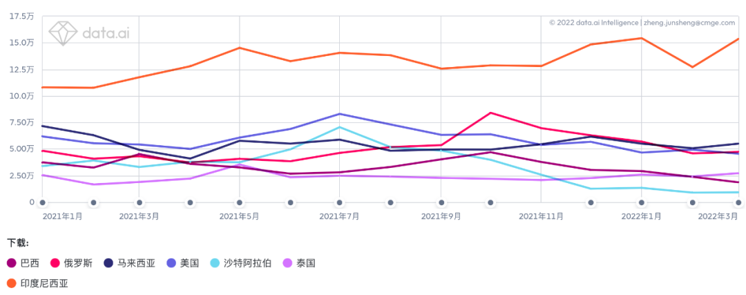 在下载量方面,《MLBB》几乎成为印尼的国民游戏,每月下载量均超过10万次,而《AOV》整体下载量无法与其比拟。可是在最大的美国市场中,《AOV》却表现更加抢眼,进入2022年单月下载量超过3万次。