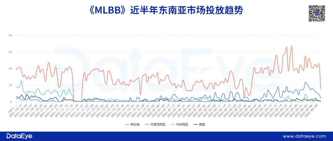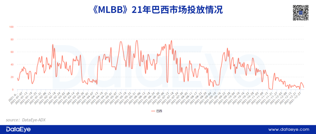 《MLBB》欧美→东南亚、日韩→巴西。根据DataEye-ADX海外版显示,《MLBB》项目组一开始在美国以及部分欧洲国家投放,然后在深入东南亚和日韩市场,而且在去年挖掘巴西等新兴市场。