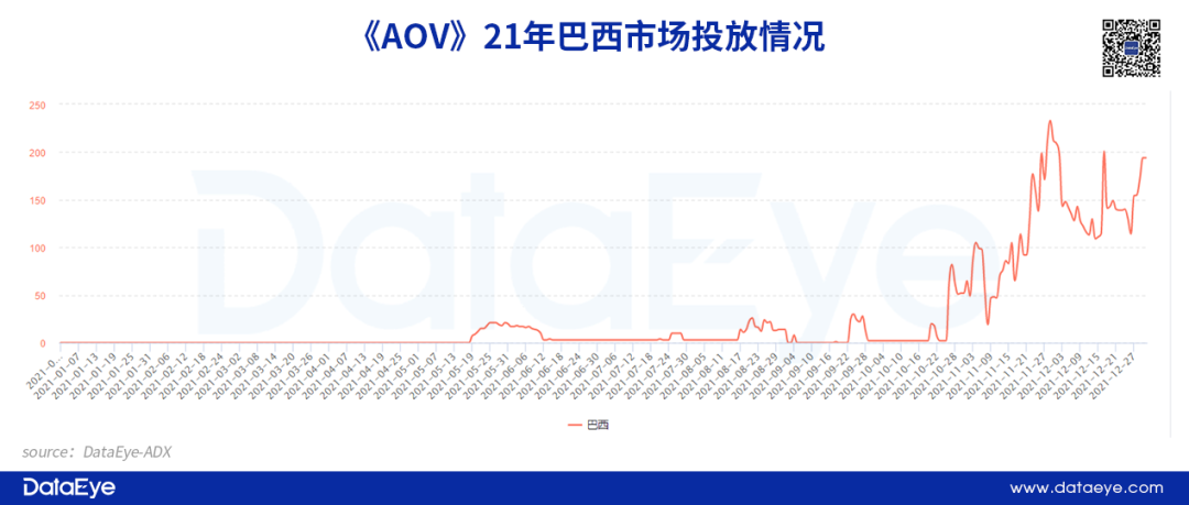 ③其它新兴市场:在美国市场和东南亚市场之外,例如巴西等移动端新兴市场已经引起了大多数出海游戏厂商的关注。从地区投放趋势来看,无论是《MLBB》还是《AOV》都在2021年进入巴西投放市场。