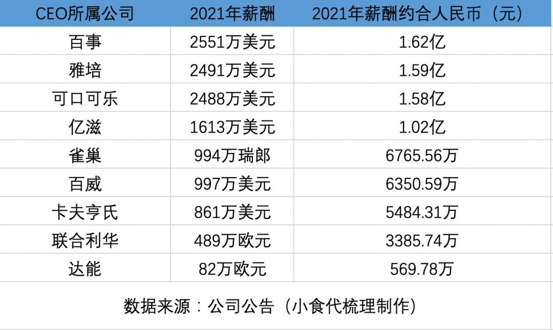 从最新榜单来看,继2020年“普降”后,大部分CEO的薪酬在后疫情时代已重新上涨,且加薪几乎都达到“千万级别”。这在某种程度上也展现了作为民生刚需的食品饮料自带韧性。