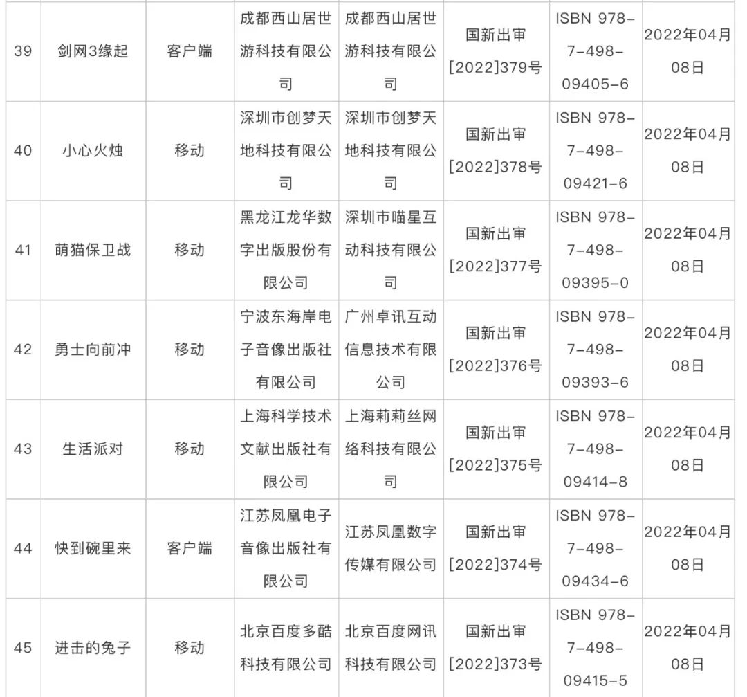 根据版署官网发布的信息,此次共有45款国产网络游戏获得版号,包括心动网络的《派对之星》、莉莉丝游戏的《生活派对》、游族的《少年三国志:口袋战役》、西山居的《剑网3缘起》、三七互娱的《梦想大航海》、创梦天地的《小心火烛》、百度的《移动的兔子》等。
