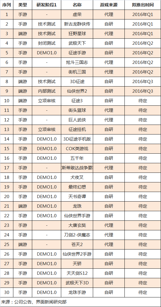 此外,巨人网络游戏储备情况也较为堪忧。界面新闻发现,巨人网络所列30款游戏储备中,仅有3款于2016年一季度之前推出,二、三季度也分别只有4款和2款新游戏上线,剩余的21款更是尚无明确时间表。在目前国内网游市场竞争非常激烈的情况下,巨人网络的游戏储备似乎略显不足。