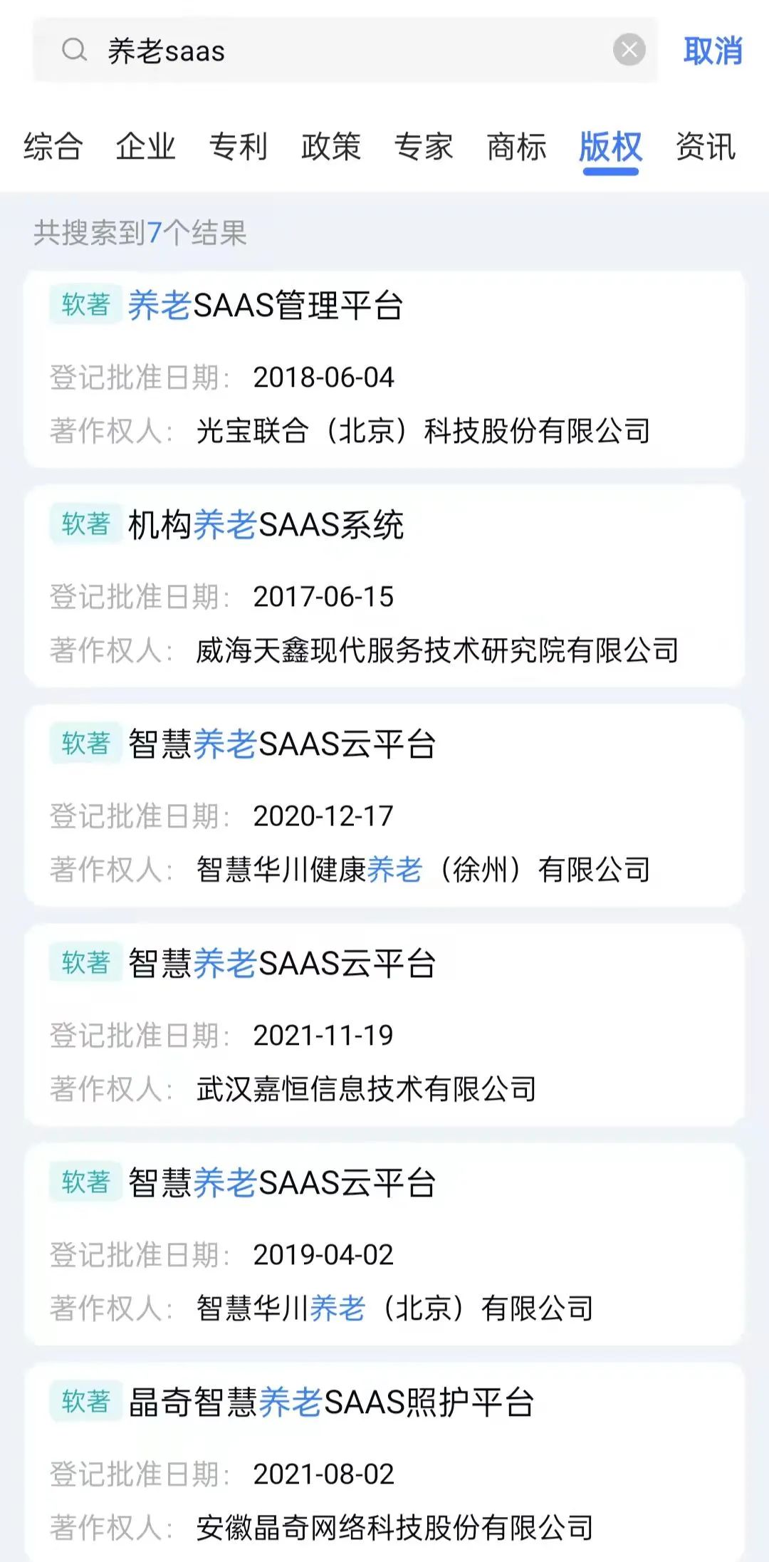 (企知道平台中,部分养老SaaS软件著作信息)