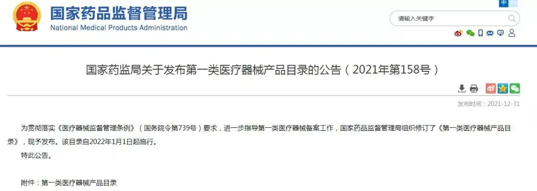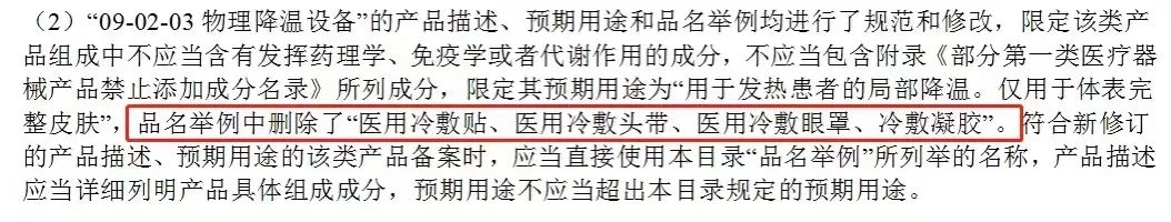 2021年12月31日,国家药监局发布新修订的《第一类医疗器械产品目录》(以下简称新《一类目录》),在品名举例中删除了“医用冷敷贴、冷敷凝胶”,并称在2022年1月1日前已完成备案的“医用冷敷贴、医用冷敷头带、医用冷敷眼罩、冷敷凝胶”等产品,在2022年4月1日前要完成备案信息变更,取消原备案或重新办理第一类医疗器械备案,