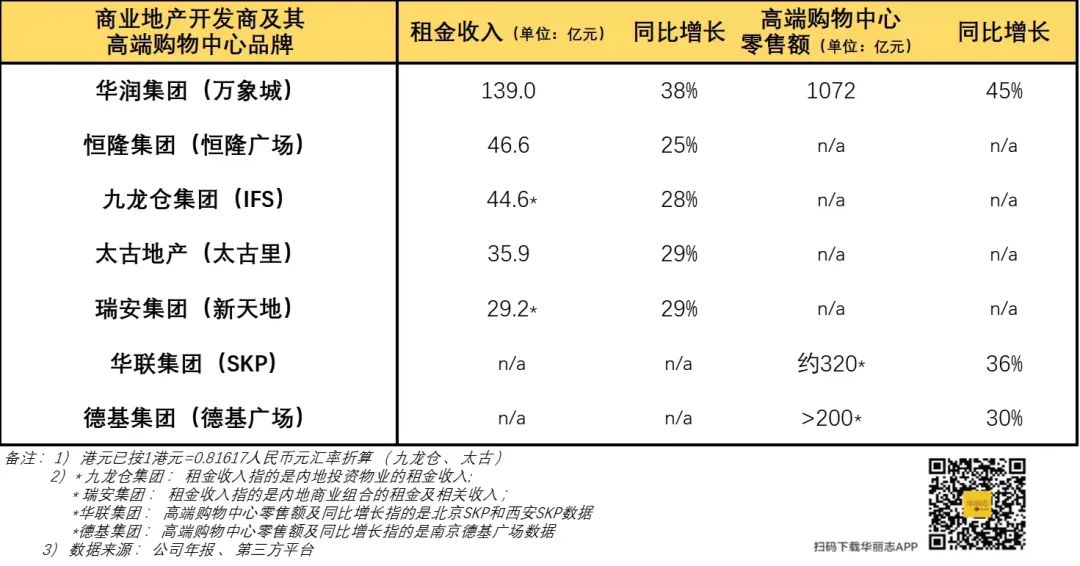 本文《华丽志》将聚焦华润集团、恒隆集团、九龙仓集团、太古地产、瑞安集团、华联集团、德基集团等七大商业地产开发商及其旗下高端购物中心项目。根据它们公开发布的财务报告以及第三方机构搜集的数据,汇总了上述七家商业地产开发商旗下高端购物中心 2021年在中国内地的租金收入及购物中心的零售额数据(部分未披露的,以 n/a 表示):