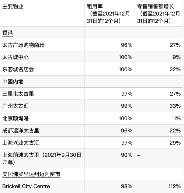 3月10日,太古地产公布了截至2021年12月31日止的年度业绩。其中三里屯太古里、广州太古汇、北京颐堤港、成都远洋太古里、上海兴业太古汇零售销售额分别增长27%、33%、11%、22%、29%;香港地区受疫情影响,零售市场受到严重干扰,但年内已趋于稳定,本地需求于2021年下半年开始回升。