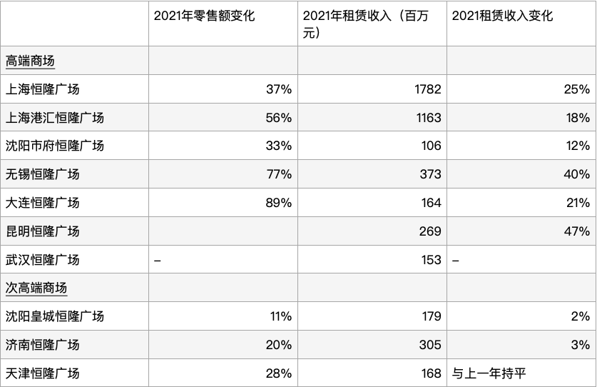 2021年,恒隆内地10个商场的租赁总收入同比增加25%至46.62亿元,其中高端商场收入增加30%,次高端商场收入则上升2%。