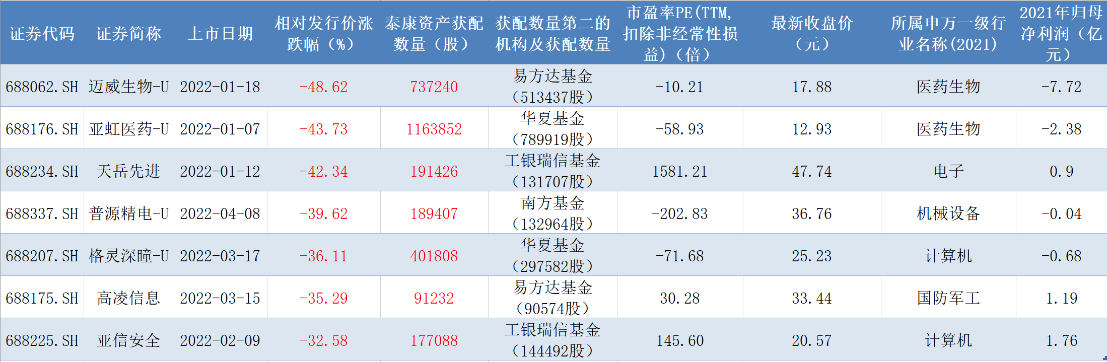 其中,迈威生物-U、亚虹医药-U、天岳先进3只今年1月上市的新股破发幅度已超40%,泰康资产获配数量分别为73.72万股、116.39万股、19.14万股。