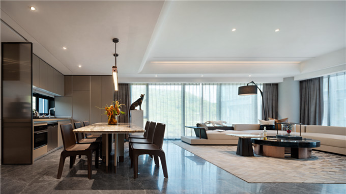 然而,最值得品味的,还是天琅在景观与外部资源融合。建筑景观设计连接延续梧桐山生态,让大自然的绿流淌进建筑,穿插于生活中,无论是会客厅、泛会所,都与自然完美互融。还未入室,便已能享受到自然带来的扑面而来的舒适之感。回到家中,更是可享尽揽山海的大横厅,全屋270°全景落地玻璃,阳光洋洋洒落,室内空气中充满自然的甘甜。坐拥山海生活的同时,城市的都市繁华也咫尺可得,天琅得天独厚,满足所有人对闲适生活的向往。