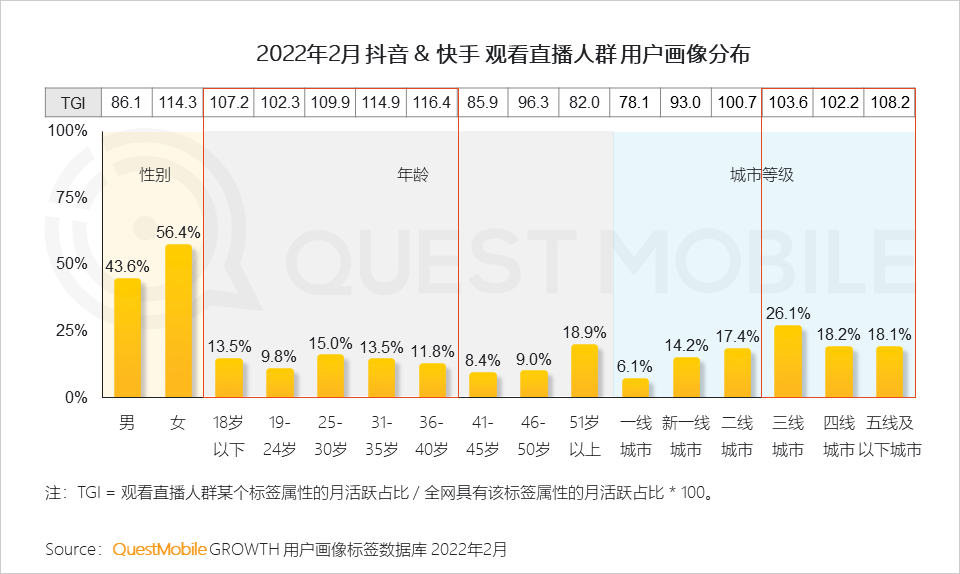 4、短视频平台中观看直播的主力人群由40岁以下用户构成,且三线及以下城市用户表现活跃,直播下沉战略已初见成效