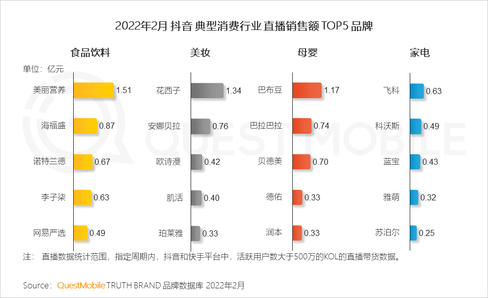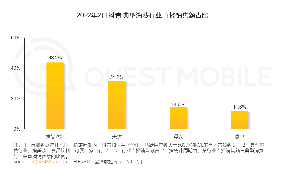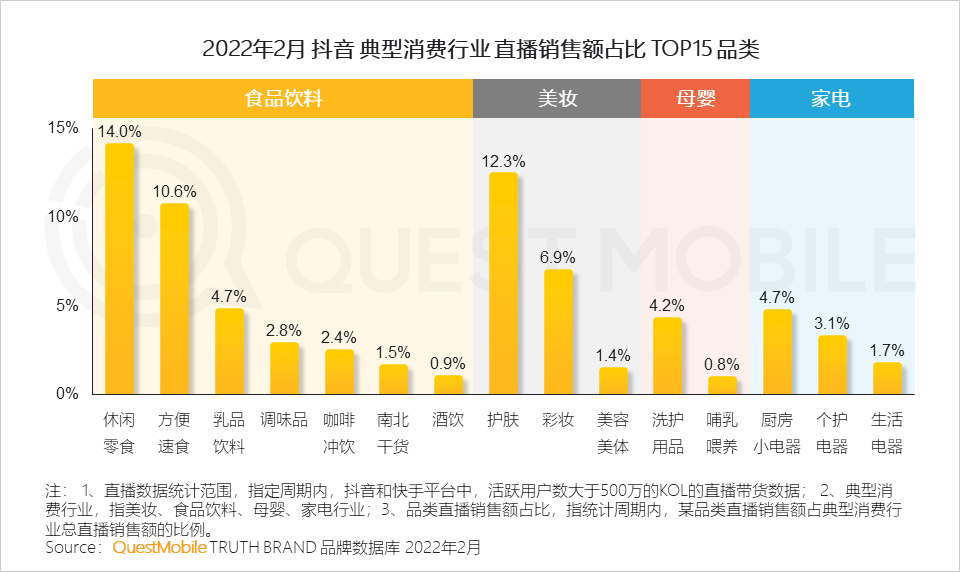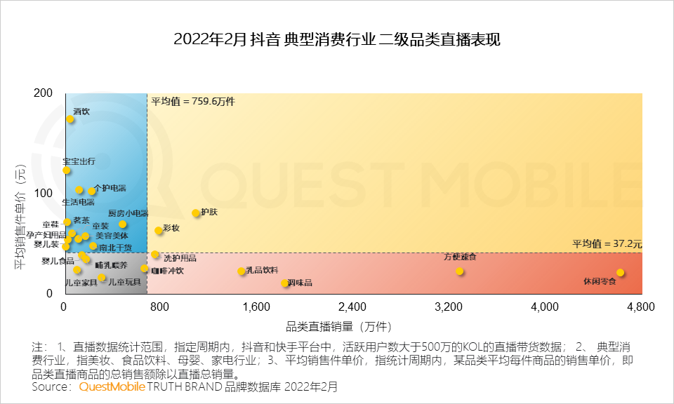 2、抖音直播中,食品饮料此类高频次低单价的产品占销售主导,其中尤其以休闲零食、方便速食类产品销量显著;而母婴与家电两大行业总体销售情况不及三分之一
