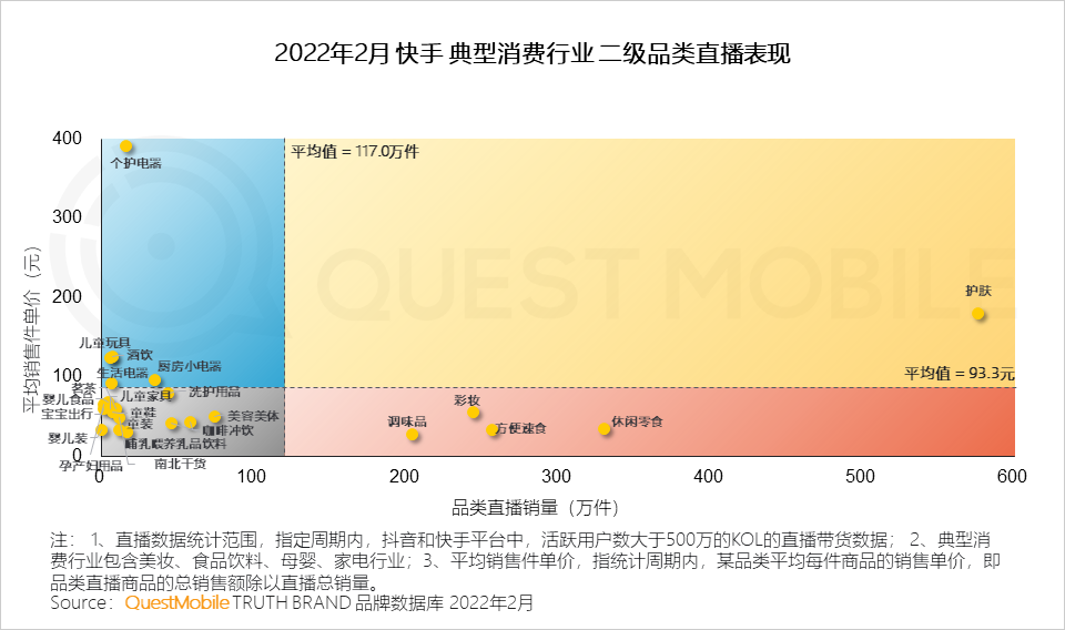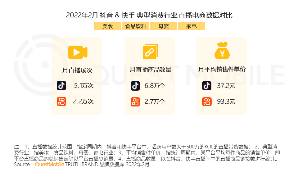 1、典型消费行业的商品布局与结构在两大平台中呈现出明显差异:抖音铺货广单价低,快手则相反;且从直播场次来看,抖音月直播场次远高于快手