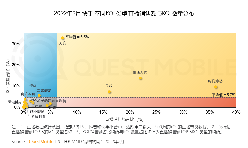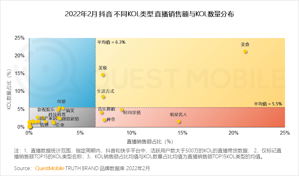 1、抖音直播中快消类产品需求密集,造就了美食类KOL“扎堆”,竞争激烈;明星名人、时尚穿搭、种草等KOL数量低于整体平均水平,但带货能力显著;小众类KOL目前正处于“角逐”状态