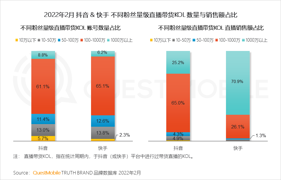 3、目前快手头部KOL直播带货效果显著,千万级粉丝数的KOL贡献了七成的直播销售额;抖音直播销售额则主要由100万-1000万粉丝的腰部KOL带动