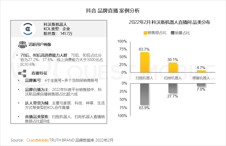 8、科沃斯以品牌自播为主,多账号细分品类运营,吸引高消费能力用户;此外与产品用户契合的达人合作带货,构建品牌直播矩阵