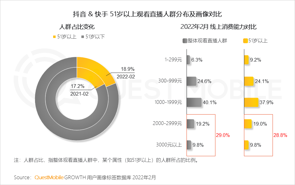 5、值得注意的是,51岁以上年长用户亦开始加入观看直播的人群行列,其消费能力不容小觑,线上消费在2000元以上的占比与整体人群持平