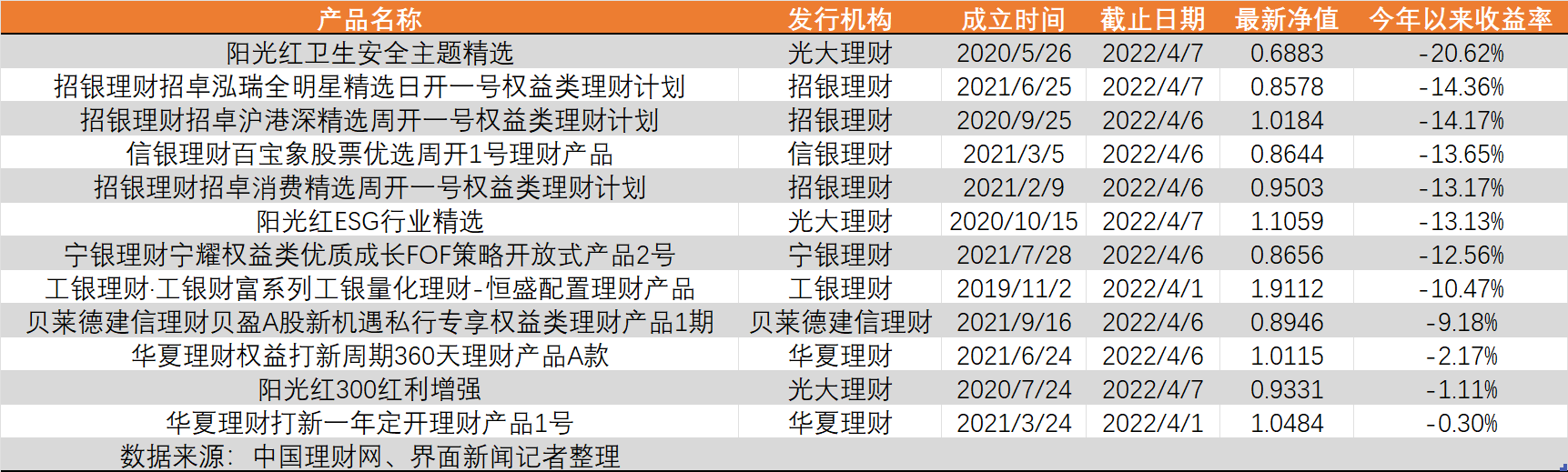 中国理财网提供的数据显示,截至目前,理财子公司已经累计发行权益类理财产品20只。由于部分产品成立时间较短,业绩表现仍有待观察,因此在列表中予以剔除。从成立时间超过6个月的12只权益产品的业绩表现来看,界面新闻记者梳理发现,上述产品今年以来收益率均为负值,其中,有9只产品今年以来跌幅超10%,占比达75%。跌幅最大的是光大理财旗下的阳光红卫生安全主题精选,今年以来跌幅达20.62%,单位净值跌至0.6883。