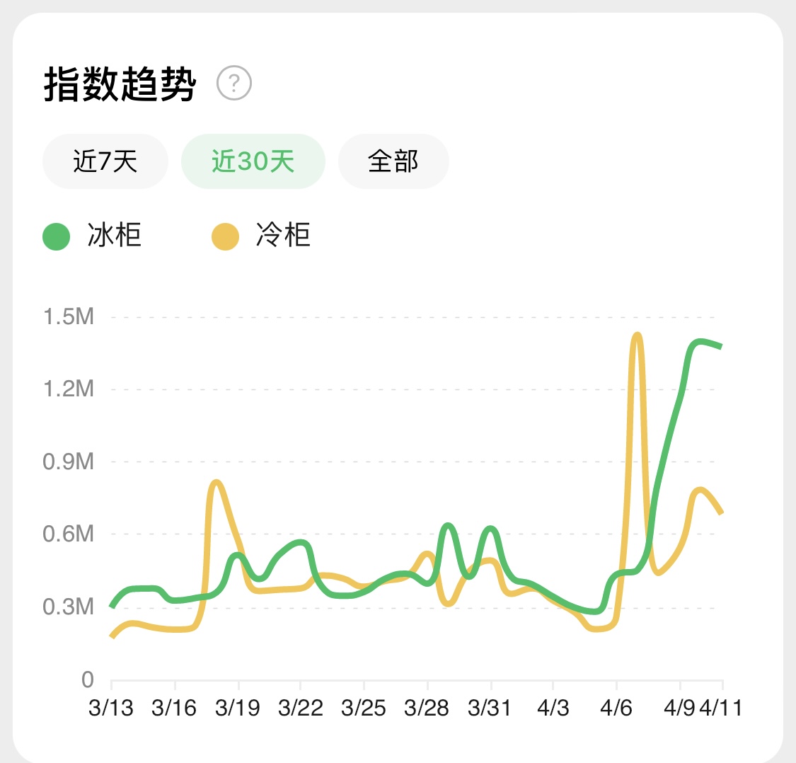 从搜索指数来看,微信指数显示,“冰柜”、“冷柜”关键词的热度自4月7日以来就呈现大幅上升趋势;“冰箱”关键词更是在4月10日达到近30日的高点。
