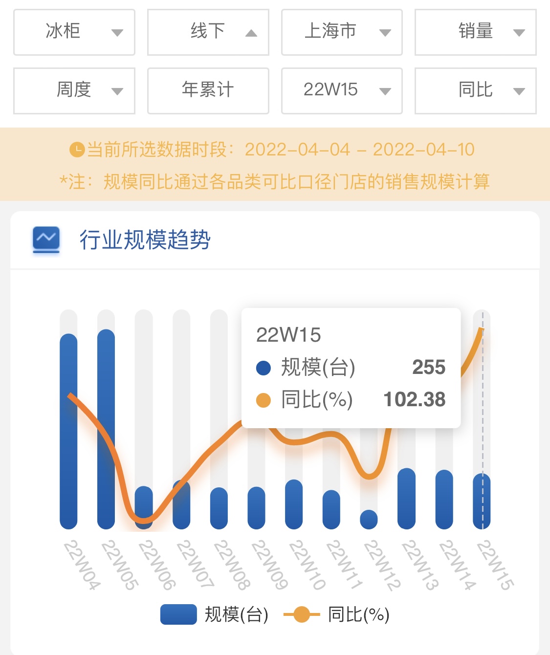 在最受关注的上海地区,中怡康数据显示,冰箱产品零售额在第十三周(3月21日-3月27日)出现明显上涨,环比增长54.5%。冰柜产品方面,奥维云网数据显示,上海地区冰柜线下销量自第十三周开始上升,到第十五周(4月4日-4月10日),销量达到了同比翻倍。